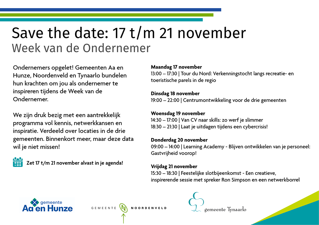 Ondernemers opgelet! Gemeenten Aa en Hunze, Noordenveld en Tynaarlo bundelen hun krachten om jou als ondernemer te inspireren tijdens de ‘Week van de Ondernemer’.