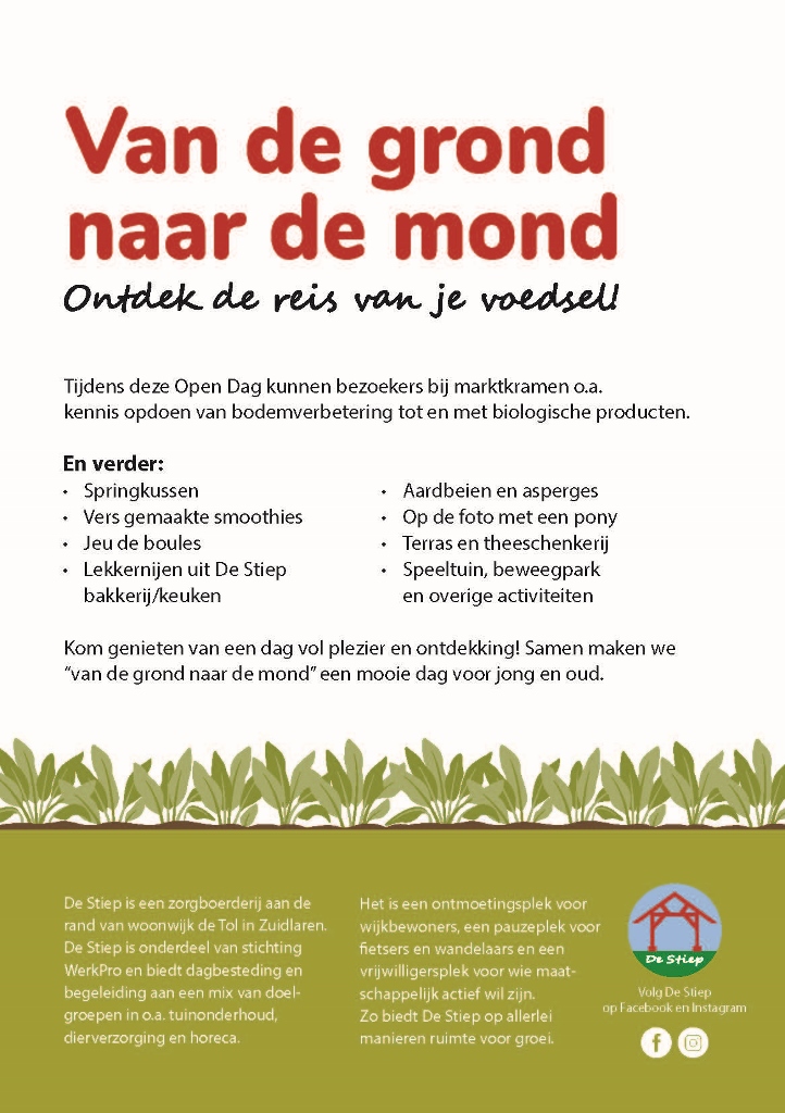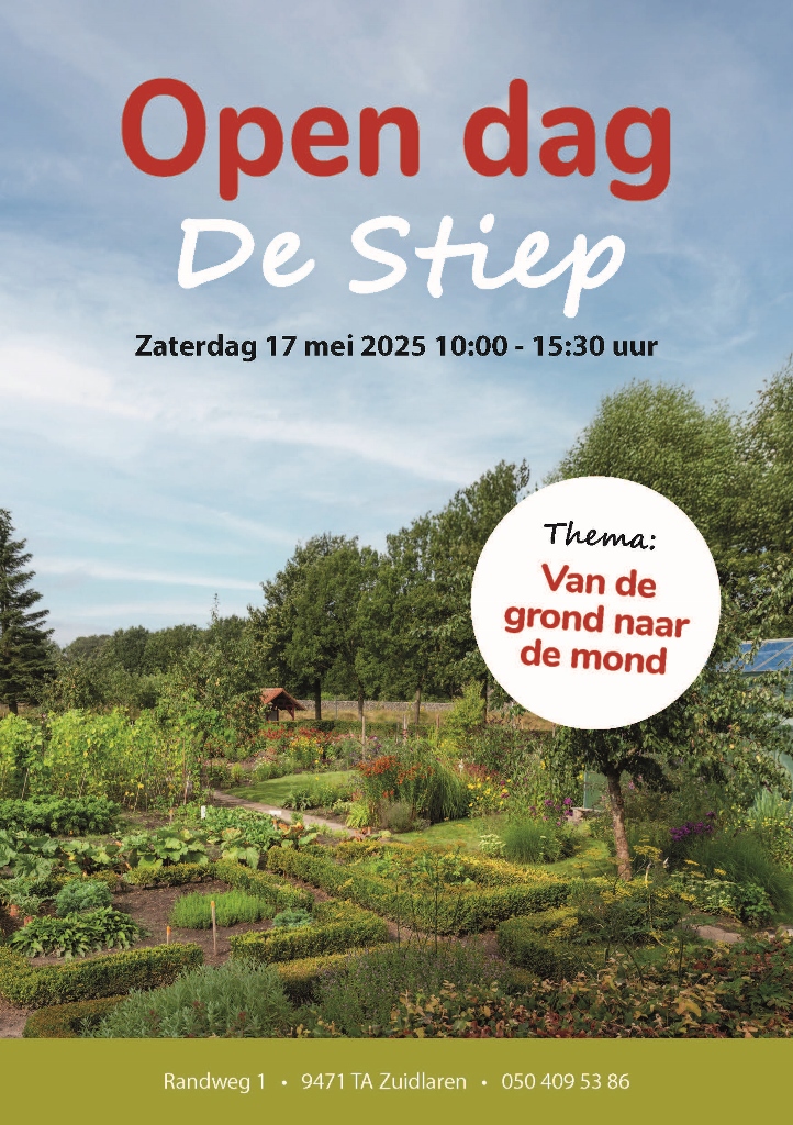 Zaterdag 17 mei 2025 van 10.00 tot 15.30 uur houdt De Stiep een open dag. Thema is Ontdek de reis van je voedsel, van grond naar mond. Bezoekers kunnen bij marktkramen informatie krijgen over bijvoorbeeld bodemverbetering en biologische producten. Er zijn activiteiten voor kinderen. Ook worden allerlei producten verkocht, zoals aardbeien en asperges en lekkernijen uit de bakkerij en keuken van De Stiep.