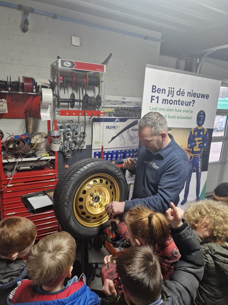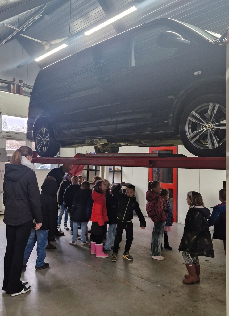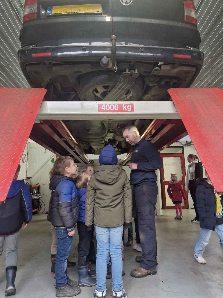 We werden er heel vriendelijk ontvangen en kregen uitleg over het werk dat de monteurs doen. De kinderen zagen hoe een bestelbus op de brug omhoog ging, zodat je de onderkant kon zien. Ook zagen ze hoe je remmen van een auto kunt testen en kunt zien of die eventueel vervangen moesten worden. De kinderen leerden de namen van verschillende gereedschappen en konden zelf aan de slag met het sleutelen aan de bouten van een wiel.