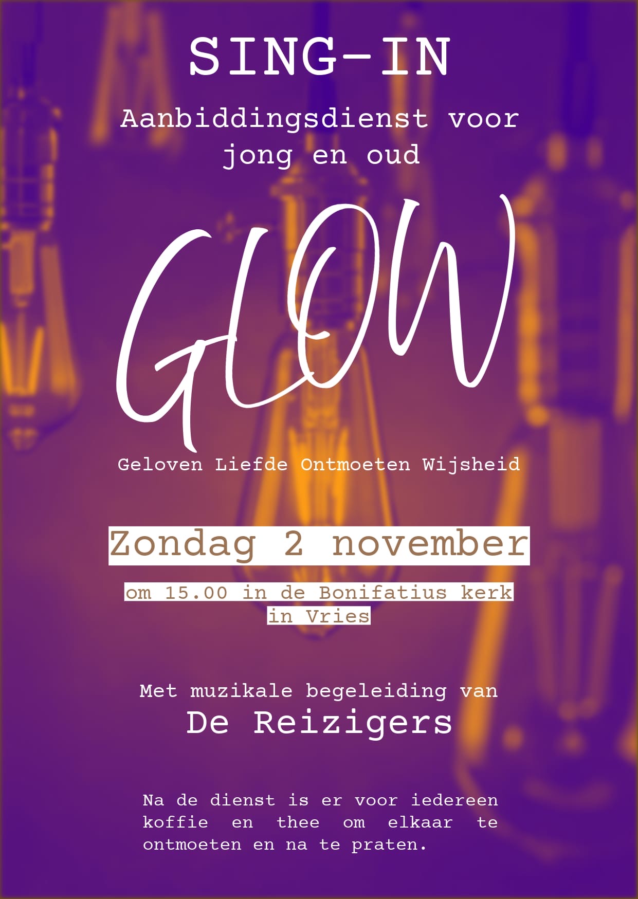 De eerste Glow-dienst op 5 oktober jl. was een groot succes! De kerk zat vol met mensen van jong tot oud. Leuk dat er ook zoveel kinderen bij aanwezig waren en dat zij enthousiast meededen met zingen, de preekbingo en rebus. Heb je deze dienst gemist of kom je graag nog een keer? Dat kan! Op zondagmiddag 2 november om 15.00 uur is de volgende Glow-dienst in de Bonifatiuskerk in Vries. Het belooft weer een mooie dienst te worden. De band ‘De Reizigers’ verleent haar muzikale medewerking. Iedereen is van harte welkom! Na de dienst kan er onder het genot van koffie en thee worden nagepraat en is er volop ruimte om elkaar te ontmoeten. Zo maken we samen een GLOW-dienst: geloven, liefde, ontmoeten en wijsheid. Graag tot 2 november! Informatie over de Bonifatiuskerk of contactgegevens vindt u op: www.pkn-vries.nl.