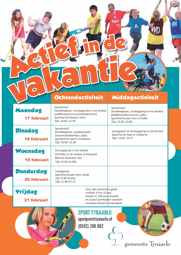 De voorjaarsvakantie komt er aan! De sportcoördinatoren van de gemeente organiseren op verschillende locaties leuke en sportieve activiteiten voor de schooljeugd. Zo is er een sportinstuif en tumblinbaan op maandagmorgen in De Kamp in Vries. Hieronder en in de flyer staan alle mogelijkheden vermeld.