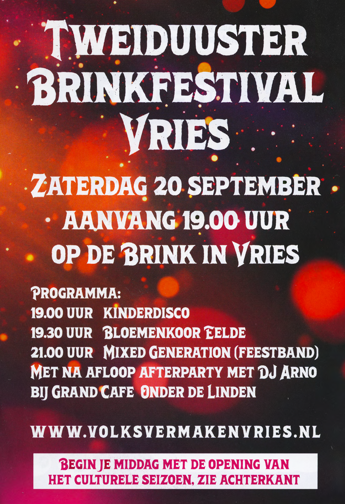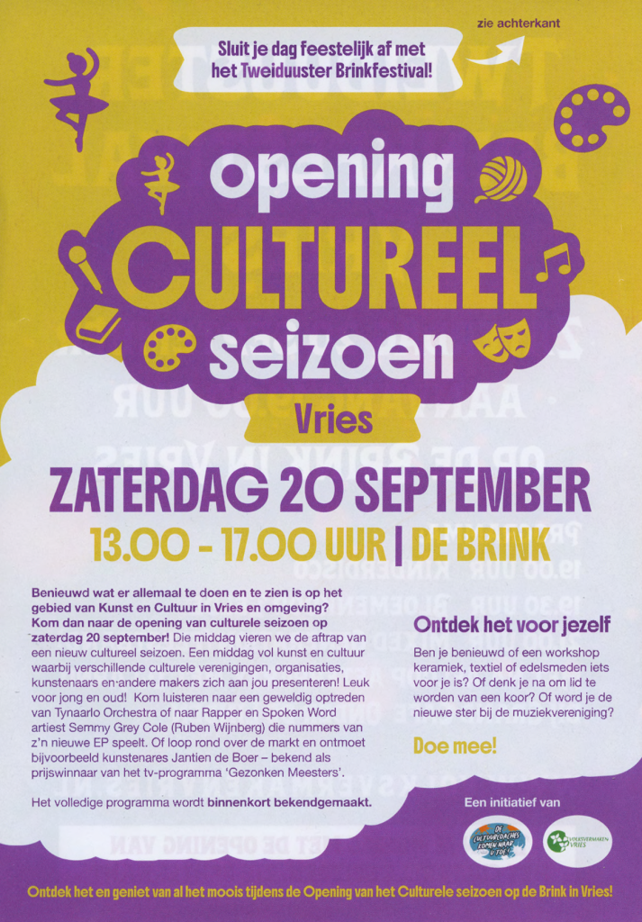 Op zaterdag 20 september van 13.00 tot 17.00 uur openen Vries en Zuidlaren het culturele seizoen met een middag vol kunst, muziek en creativiteit. In Vries is er voorafgaand aan het Tweiduuster Brinkfestival een gezellige markt met lokale verenigingen, kunstenaars, waaronder Jantien de Boer en optredens van o.a. het Tynaarlo Orchestra en spoken-word artiest Semmy Grey Cole.
