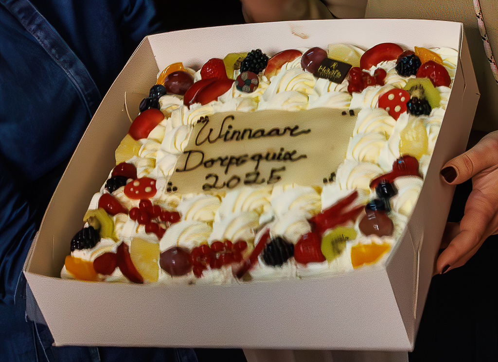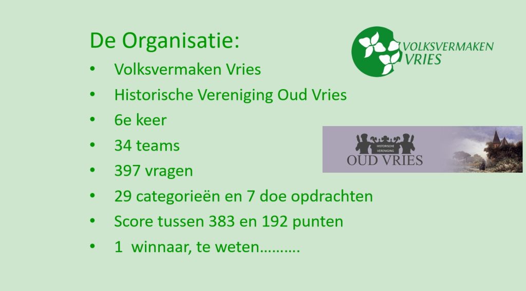 Simon vroeg de vertegenwoordigers van deze teams naar voren en begon aan de laatste verlossende uitslagen. De uiteindelijke winnaar werd het team ‘Ik weet het ook niet meer’. De feestvreugde bij de aanwezige leden was bijzonder groot. Uit handen van het winnende team uit 2024 ontvingen zij de felbegeerde wisselbeker. Jan Gritter van de Historische Vereniging Oud Vries reikte de taart uit. Tijdens de gezellige nazit is deze, zoals de traditie het vereist, gezamenlijk opgegeten.