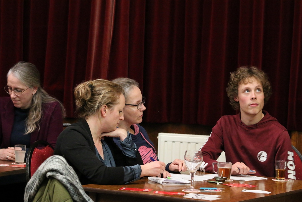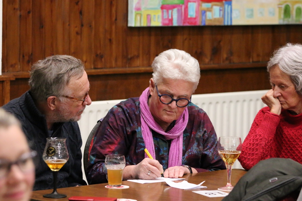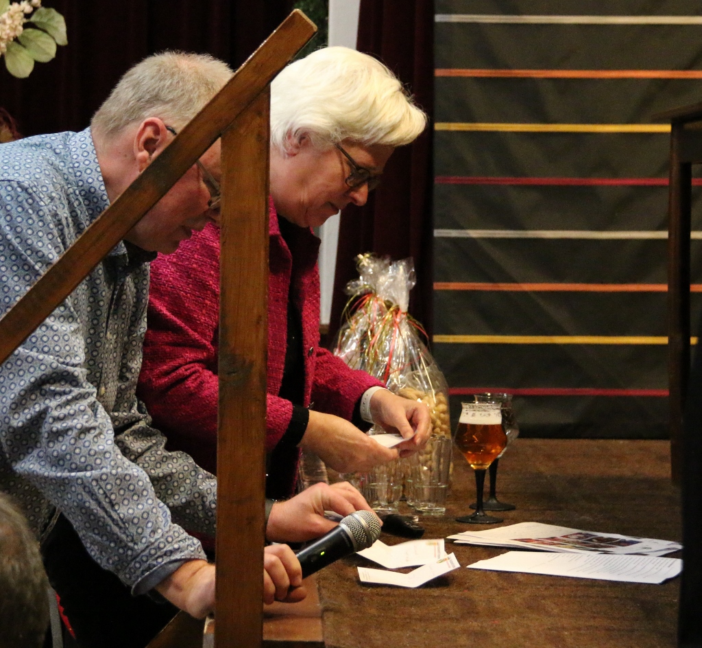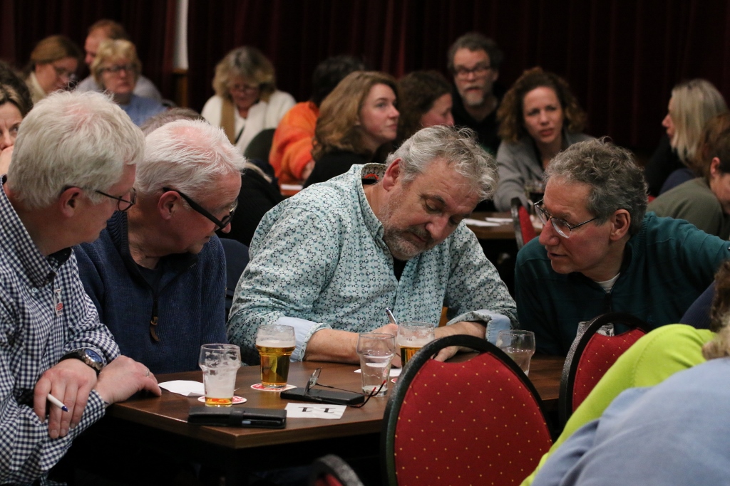 En dan de quiz zelf. Het was weer een samenstel van gevarieerde vragen, waarbij de parate kennis van de aanwezigen danig op de proef werd gesteld. De muziekronde bestond deze keer uit 10 verschillende volksliederen. Er waren een aantal teams die er maar liefst negen goed wisten in te vullen.