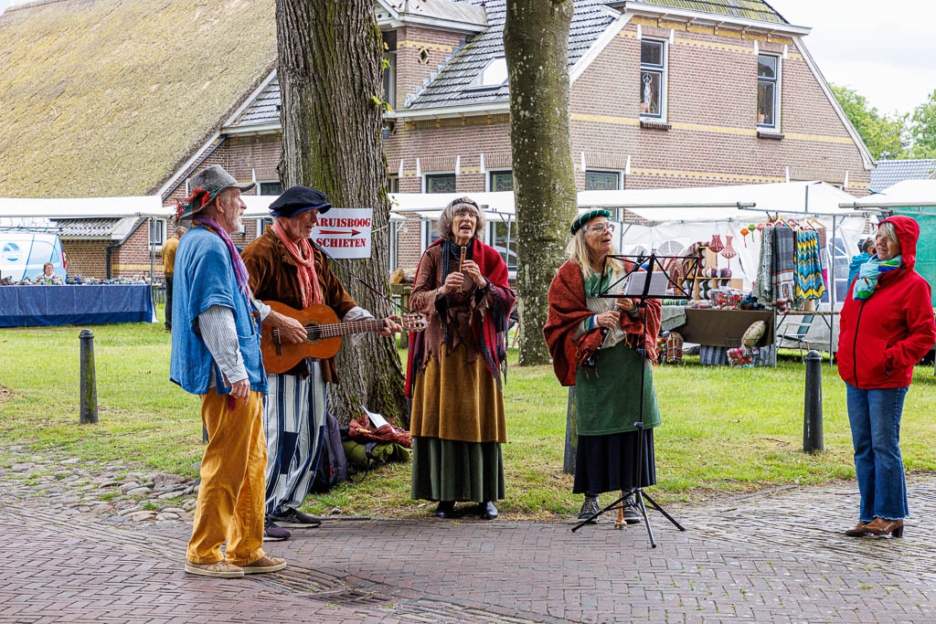 Terug naar buiten, daar was in middeleeuwse sfeer en aankleding van alles te beleven. Op de Brink kwamen spelers van Dio voorbij en een middeleeuwse zang- en dansgroep vermaakte met tussen posen het aanwezige publiek. In de schuur van Gosse en Annie was het mogelijk om met een kruisboog de schietvaardigheid te testen. Op de markt werd van alles aangeboden. Het ging het er onder andere van gesteenten tot poffers en andere etenswaar. Diverse stichtingen en verenigingen hadden er ook een kraam en in een tent werden middeleeuwse verhalen verteld.