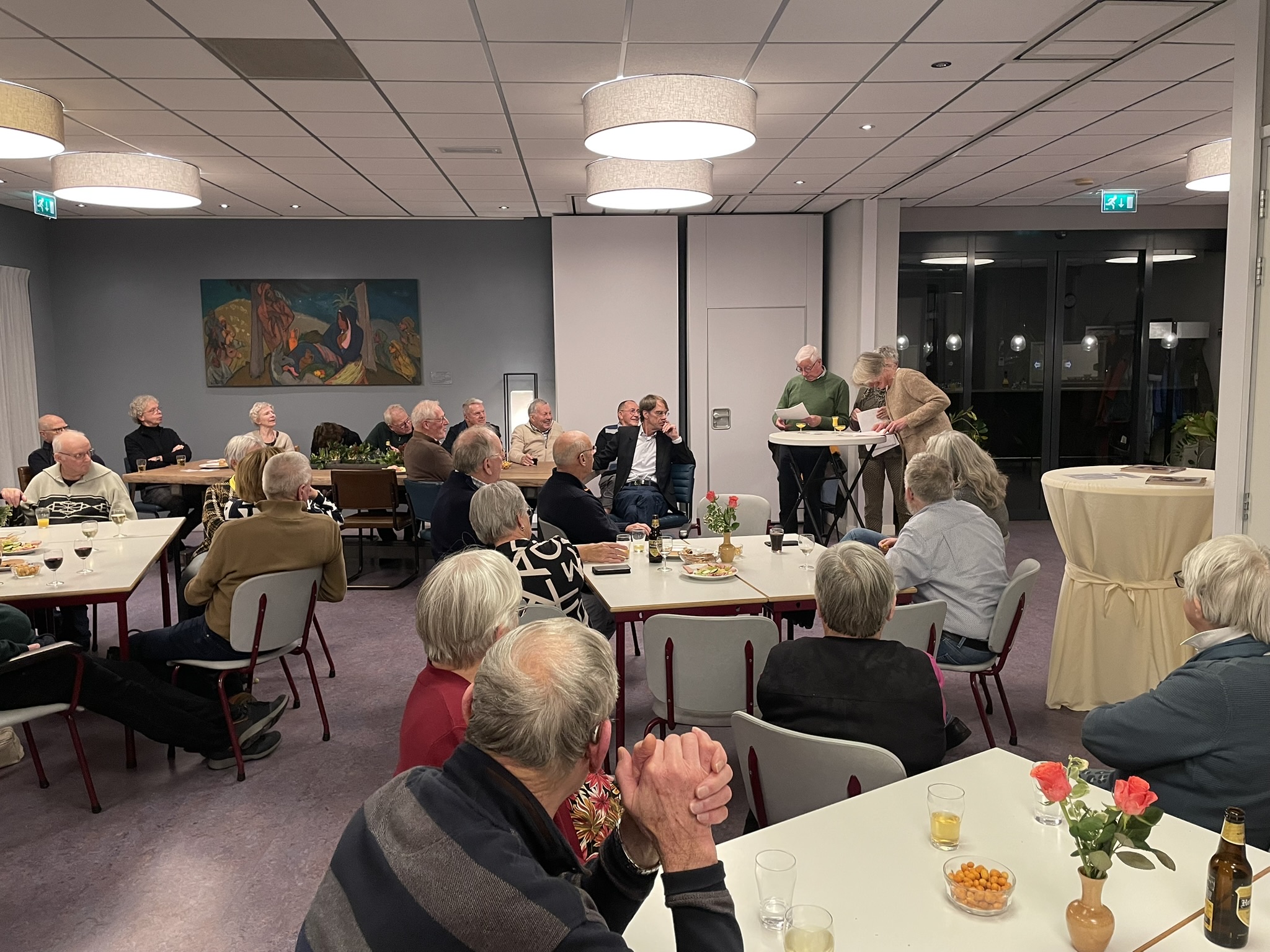 Na de lezing was het tijd voor een borrel en een hapje. Tijdens deze borrel blikten drie leden van de vereniging terug op het jaar 2024. Het verhaal in dichtvorm, geschreven door Jan Zuurd, werd weer prima vertolkt door de Roelie Buiter, Gea Huizing en Gerard Geerligs.