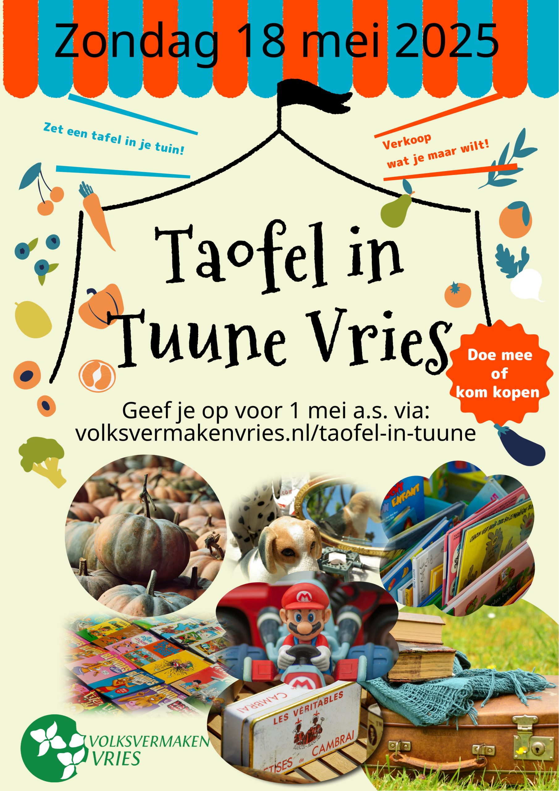 Inschrijven kan via https://www.volksvermakenvries.nl/taofel-in-tuune/ Let op: de uiterste inschrijfdatum is 1 mei. Daarna is opgave niet meer mogelijk, omdat de plattegrond met alle deelnemende adressen wordt samengesteld en verspreid op diverse locaties.