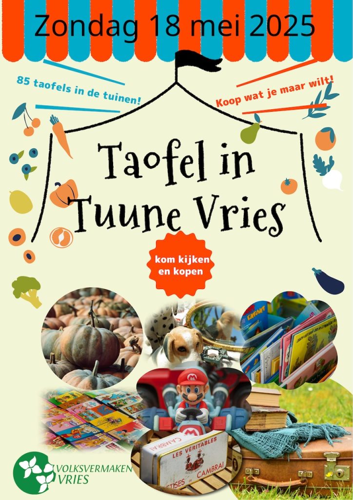 Op zondag 18 mei a.s. organiseert Volksvermaken Vries Taofel in Tuun(tj)e: een gezellige, dorpsbrede tuinverkoop in Vries waaraan meer dan 80 adressen meedoen. In tuinen, schuren en op opritten verspreid door het hele dorp verkopen inwoners hun tweedehands spullen, curiosa, boeken, speelgoed, kleding en meer. U vindt de adressen op bijgaande kaart en lijst.