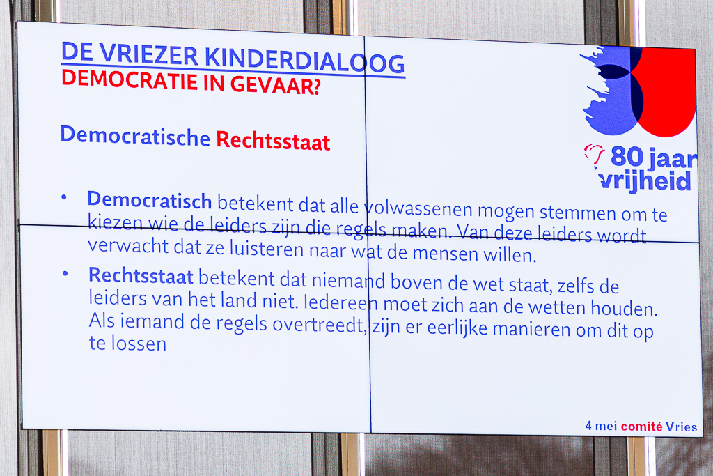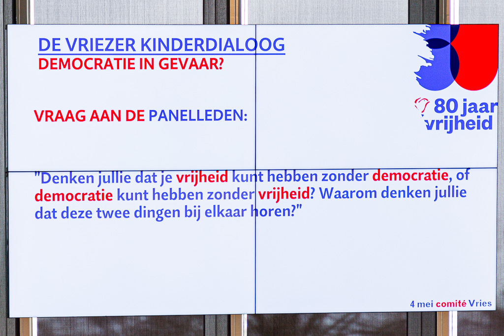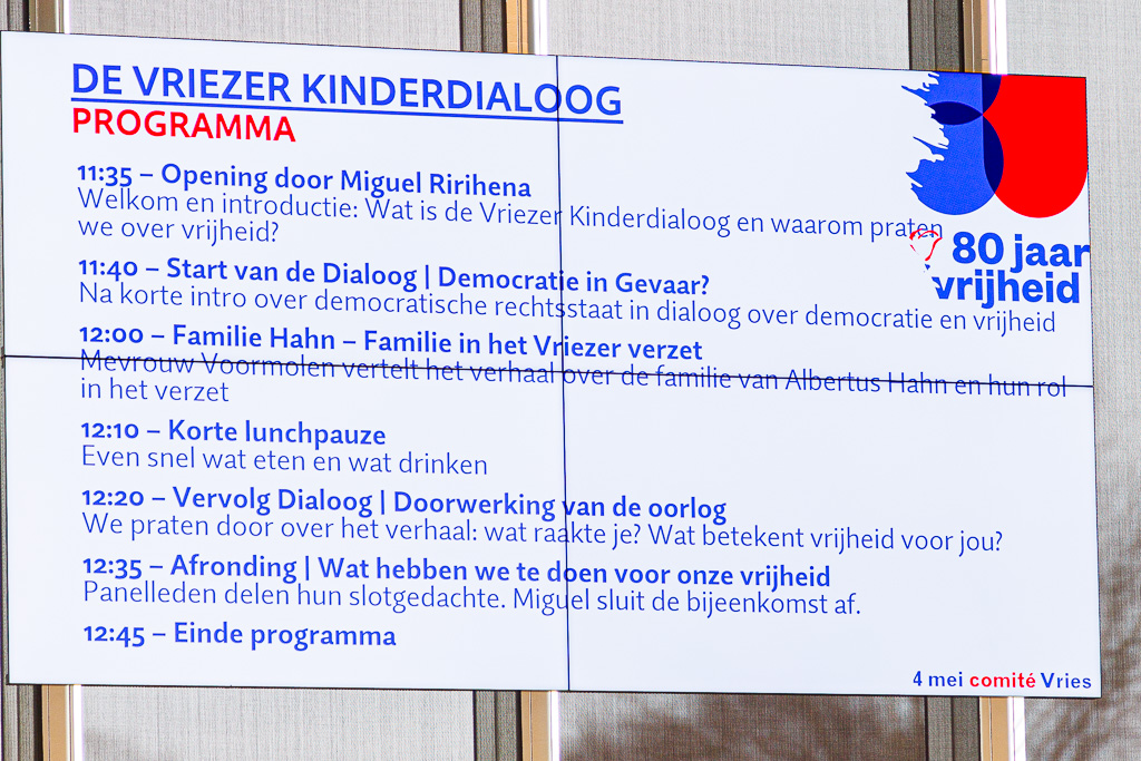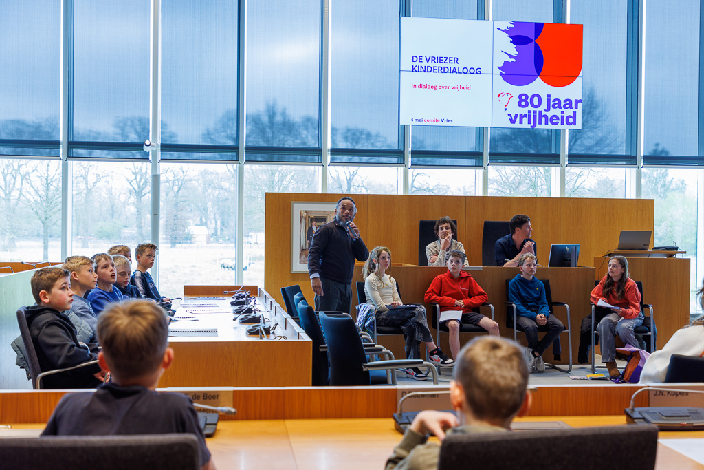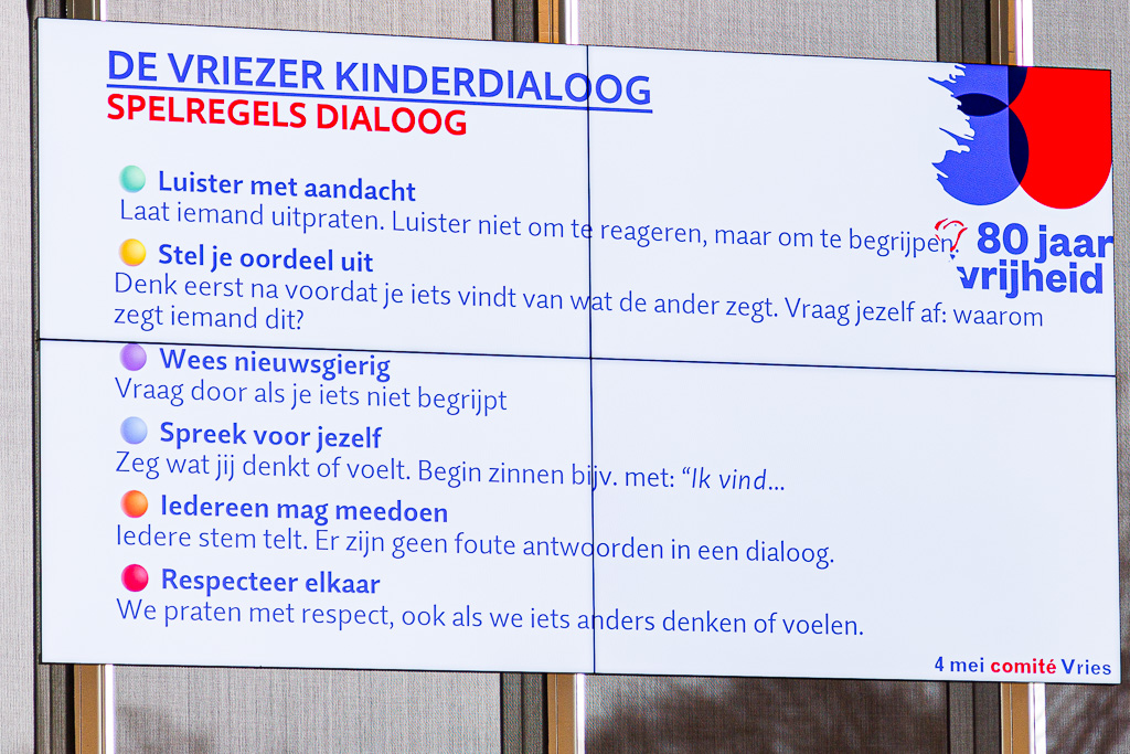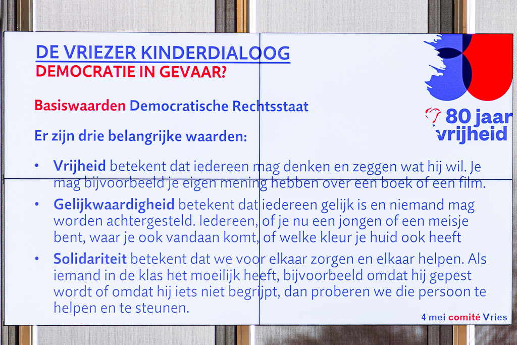 Vanmorgen organiseerde het 4 mei comité Vries voor de eerste keer een ‘Kinderdialoog”. Tegen de achtergrond van ’80 Jaar Vrijheid”, de oorlogen in o.a. Oekraïne, Gaza en Syrië is “Vrijheid” hier niet meer zo vanzelf sprekend meer. Tijd dus om daarover met onze leerlingen uit de 8e groepen in een goed gesprek te gaan. Met die term “goed gesprek” had de gespreksleider en mede organisator Miguel Ririhena, meteen de koe bij de horens want een goed gesprek doen we in een dialoog met elkaar.