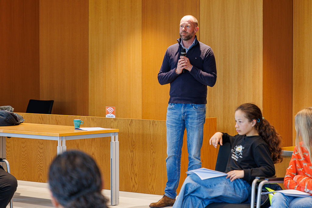 Nadat Miguel de opzet van de bijeenkomst had uitgelegd en het panel bestaande uit v.l.n.r. Nora, Rubin Jan (beide van De Holtenhoek), Arnoud en Bo (beide van De Vijverstee) had voorgesteld ging de dialoog van start. Als eerste gastspreker legde wethouder Jurryt Vellinga uit hoe onze lokale democratie is georganiseerd. Zoals, wie vervult hierin welke rol en hoe worden onze vertegenwoordigers gekozen.
