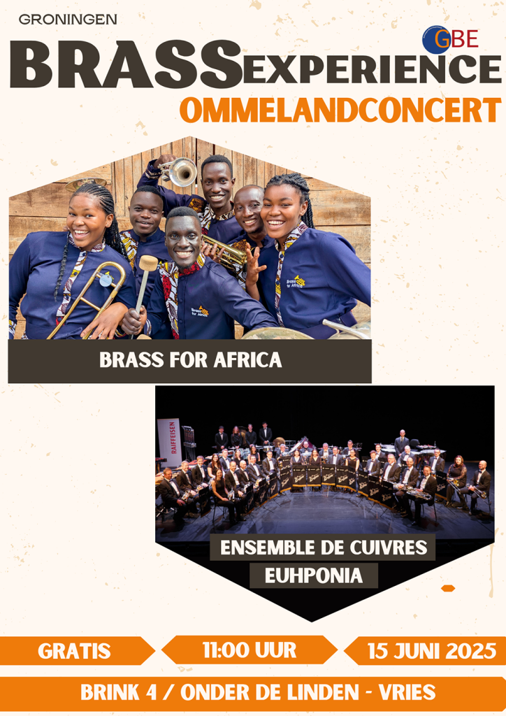 Grand Café Onder de Linden presenteert een “Uniek concert door een unieke groep muzikanten uit Oeganda en Zwitserland”. Brass for Africa en Ensemble de Cuivres Euponia spelen op zondag 15 juni in Vries.