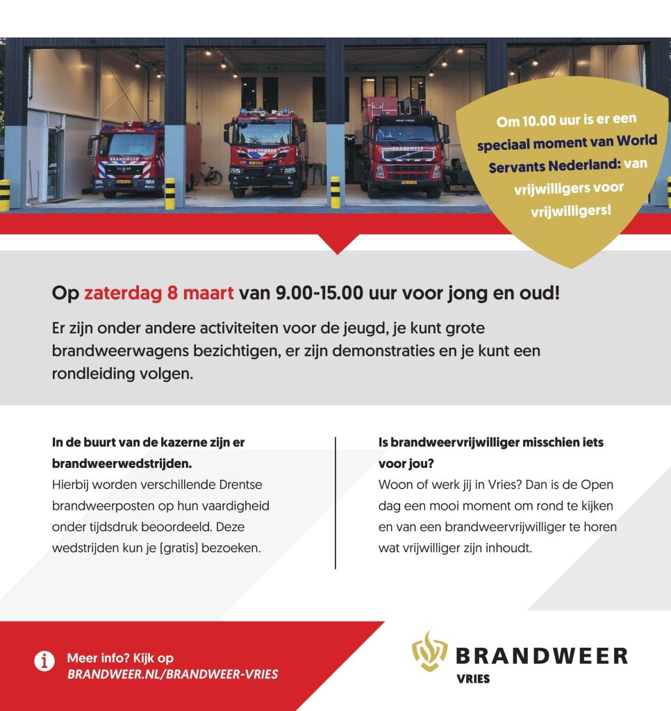 Op zaterdag 8 maart is er een Open dag bij brandweer Vries aan de Westerstraat 26 in Vries. Er zijn onder andere activiteiten voor de jeugd, bezoekers kunnen grote brandweerwagens bezichtigen, er zijn demonstraties en er is een rondleiding. De Open dag is van 9.00 tot 15.00 uur. Bezoekers wordt gevraagd met de fiets te komen. Mensen die met de auto komen wordt geadviseerd de parkeerplaatsen bij de Bonifatiuskerk of bij het gemeentehuis te gebruiken.