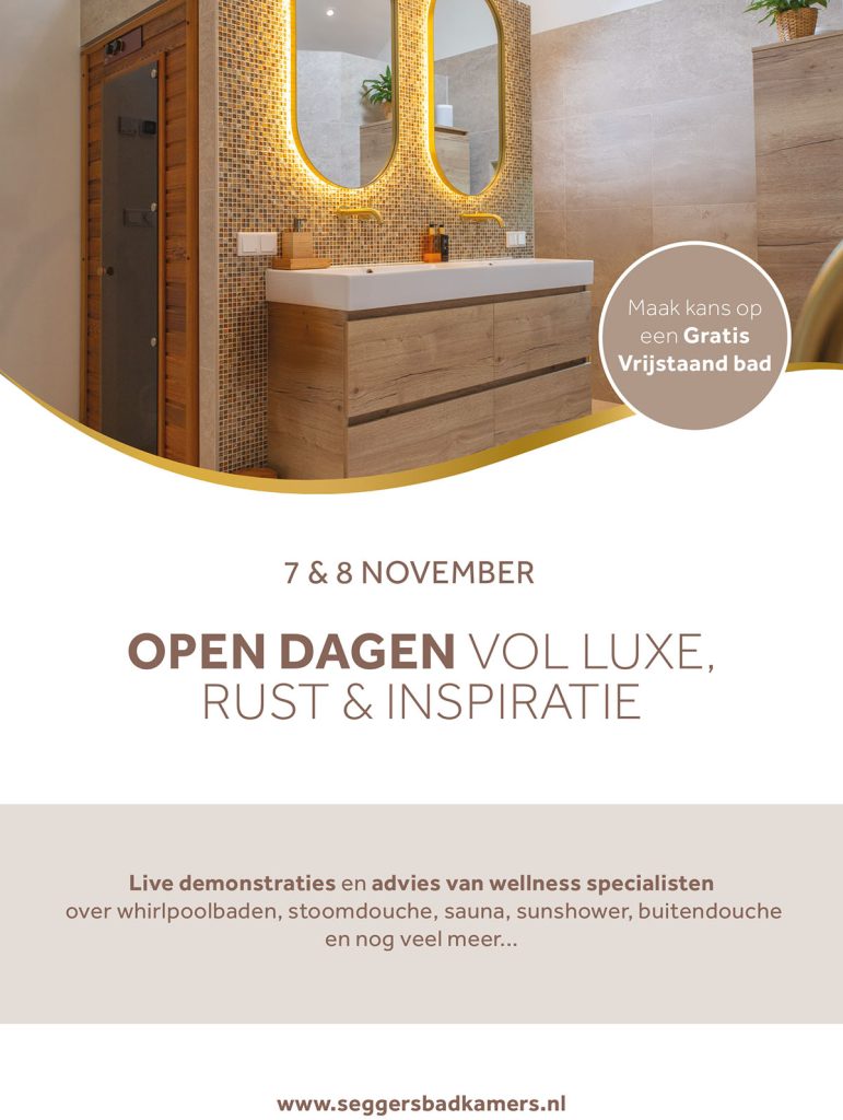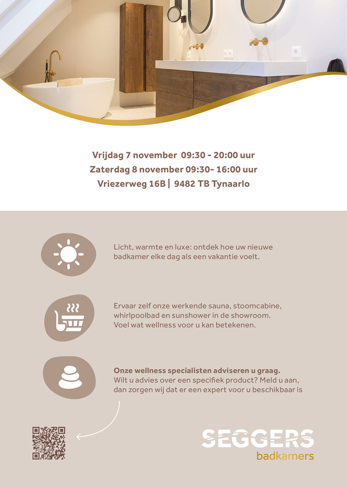 Op vrijdag 7 en zaterdag 8 november organiseert Seggers Badkamers in Tynaarlo speciale open dagen. Een mooi moment om binnen te lopen, de sfeer te proeven en volop inspiratie op te doen voor uw (toekomstige) badkamer.
