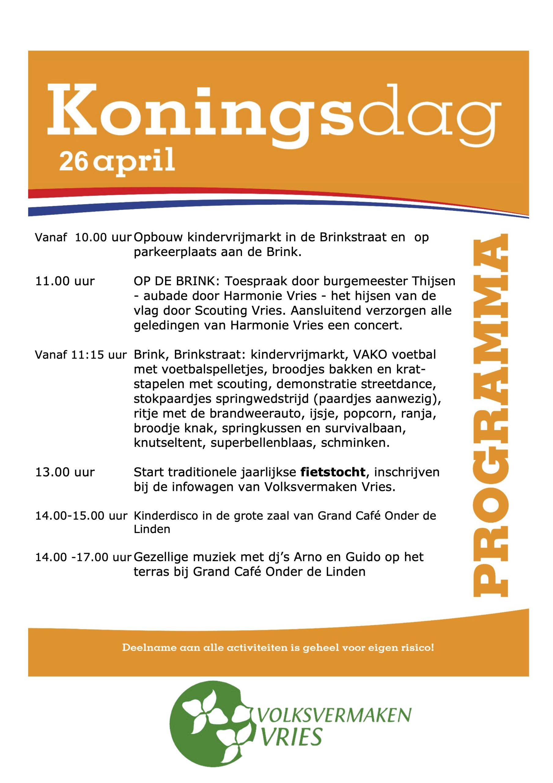 Op zaterdag 26 april a.s. kleurt Vries oranje tijdens de feestelijke viering van Koningsdag, georganiseerd door Volksvermaken Vries. Van jong tot oud: iedereen is van harte welkom om samen de verjaardag van de Koning te vieren met een dag vol plezier, muziek en traditie.