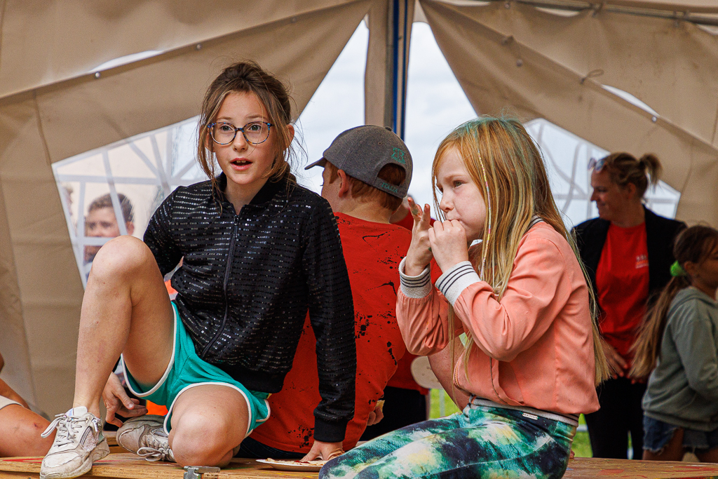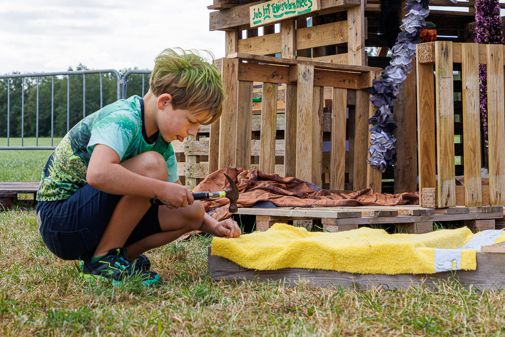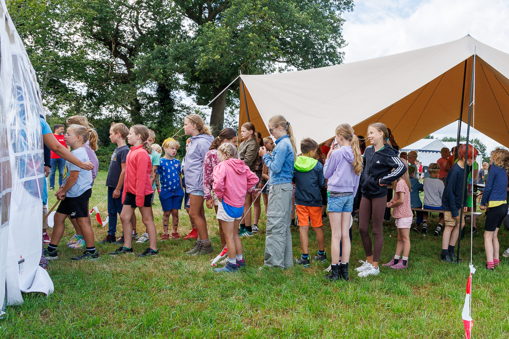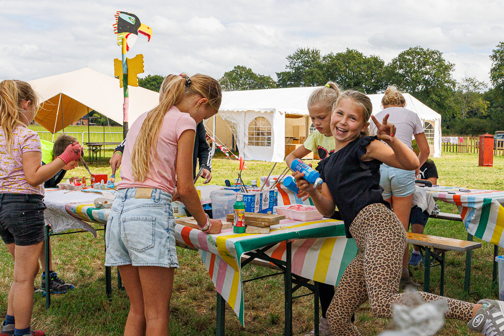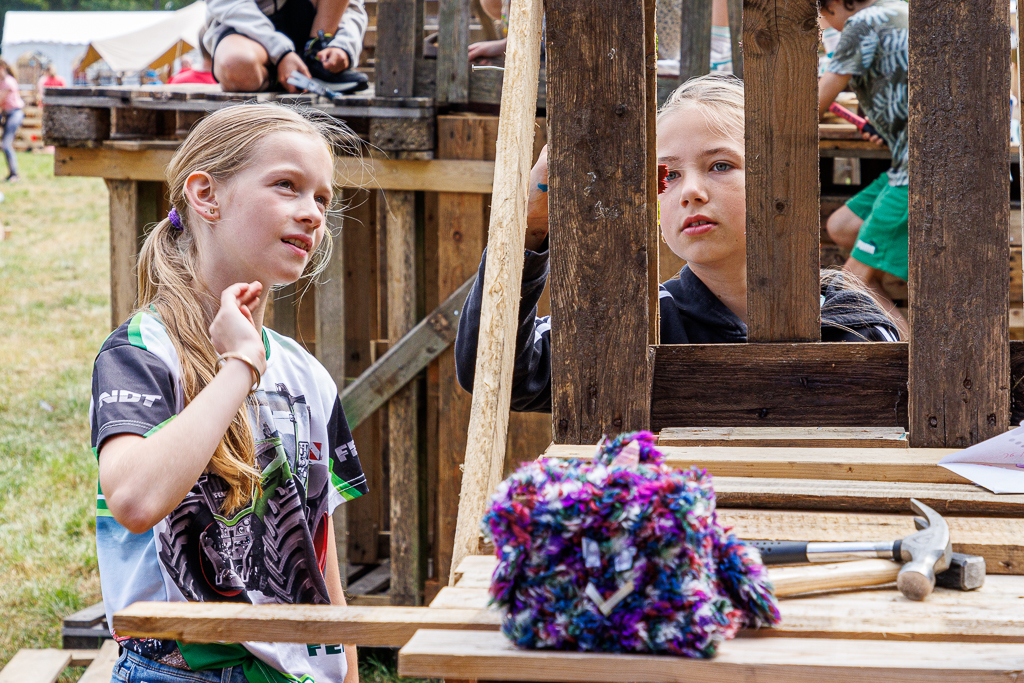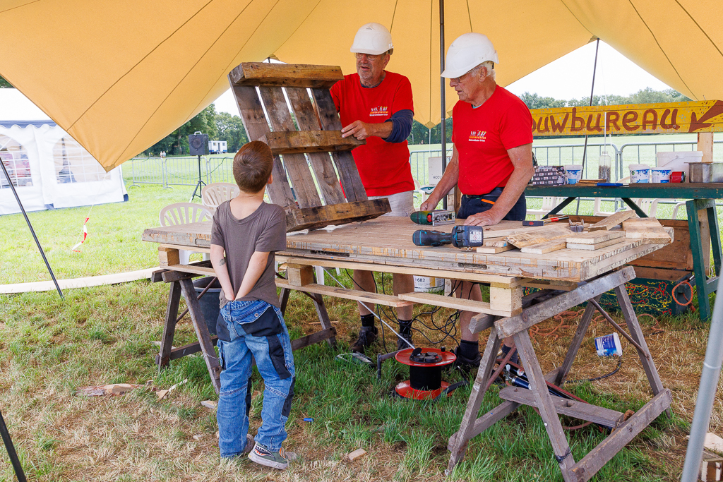 Natuurlijk was het ook weer gezellig druk bij het kaarten maken, de optuttent en de creativiteitstent. Daar kunnen de kinderen hun creativiteit en wensen uitleven. Bij de tent van de bouwbureau en -ondersteuners werden de pellets in de gewenste vorm gezaagd.