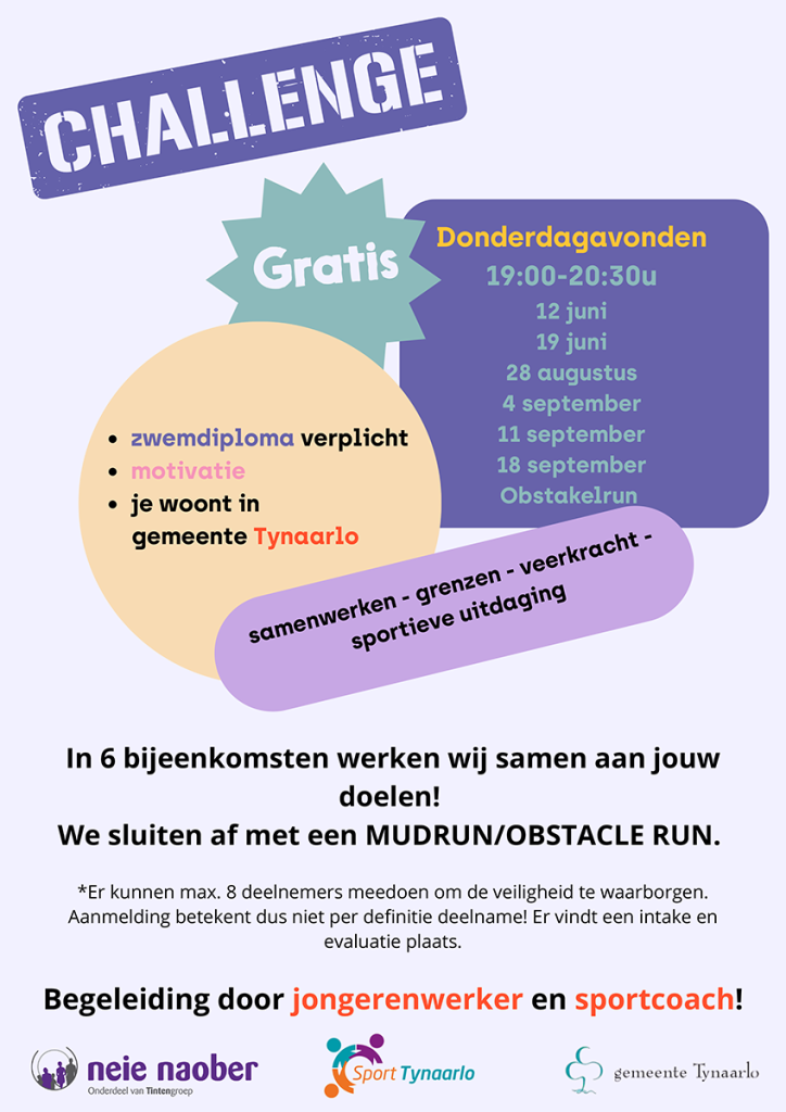 CHALLENGE is een project voor meiden van 15 tot en met 18 jaar uit de gemeente Tynaarlo. Doel: het leren kennen van jezelf en anderen, kunnen omgaan met uitdagingen en het even leegmaken van je hoofd.