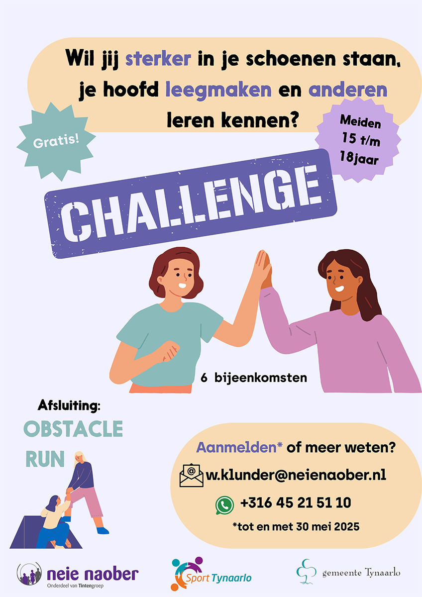 CHALLENGE is een project voor meiden van 15 tot en met 18 jaar uit de gemeente Tynaarlo. Doel: het leren kennen van jezelf en anderen, kunnen omgaan met uitdagingen en het even leegmaken van je hoofd.
