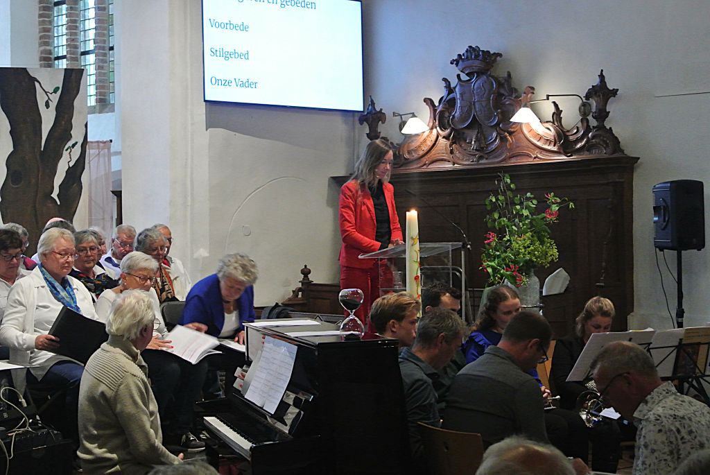 Het was wegens Pinksteren, maar ook wegens jubileum van de kerk dat het een bijzondere viering was. Het was voorganger Esther de Vegt die vertelde over Pinksteren, een overdenking over geduld en het gebed deed. Tussendoor een schriftlezing uit de Bijbel in gewone taal.