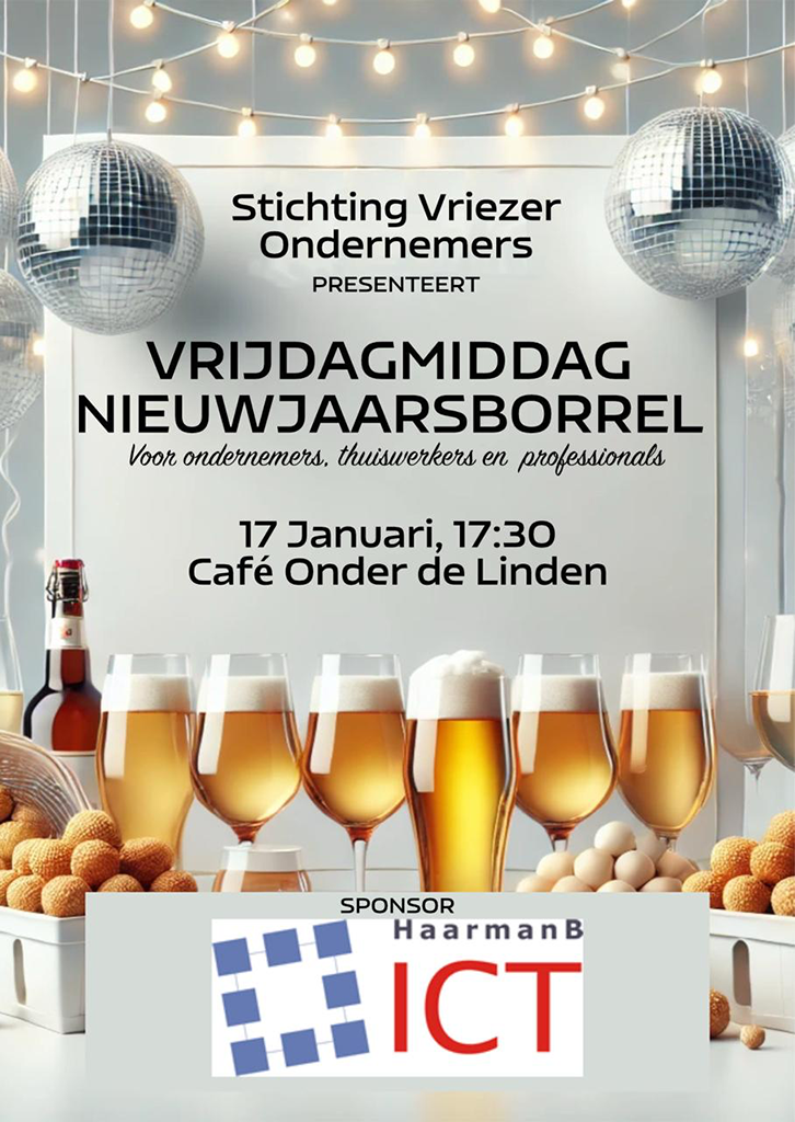 Op vrijdag 17 januari aanstaande organiseert de Stichting Vriezer Ondernemers weer een vrijdagmiddagborrel (‘vrijmibo’), dit keer in het teken van een Nieuwjaarsborrel.